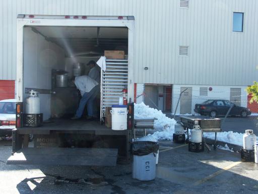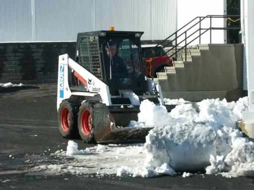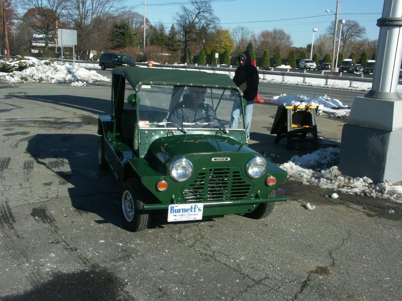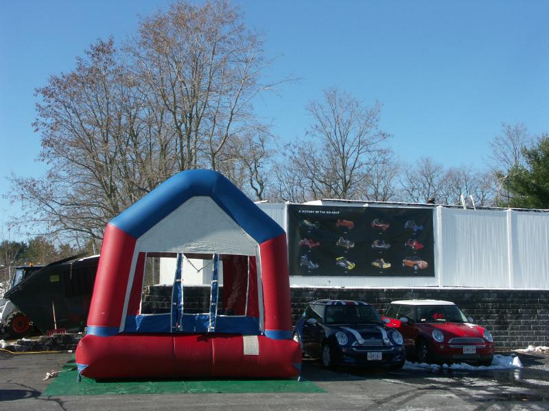 Once all the MINIs had headed off, we prepared for their return at the dealership; a few other MINIs turned up, and the caterers prepared lunch. The bouncy castle was inflated, and Martin relieved some stress by shifting snow. Also, a classic Mini Moke arrived from Burnetts Garage, to join the fun.