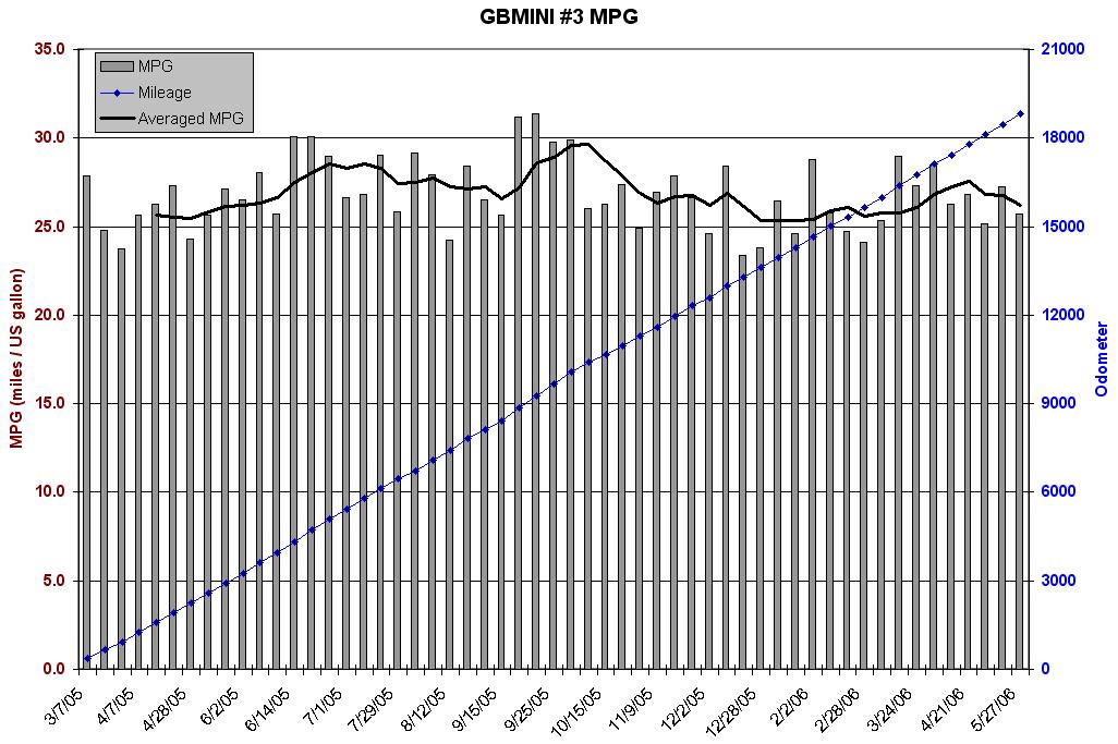GBMINI#3, with its automatic transmission, is averaging 26.95 on 7.5K miles so far.