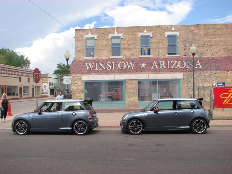 Today was spent driving, mostly on I-40 which is long, straight but quite scenic … We stopped a couple of times to take pictures (“standing on the corner“!), we found and passed some other MINIs, or had them pass us, and we got some serious rain, which demonstrated the need for a rear wiper!