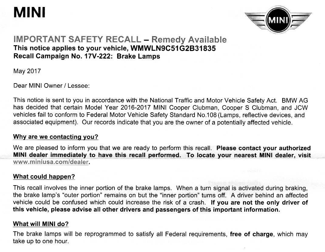 There was a recall last year on my Clubman, that didn’t sound particularly serious, but was resolved during my service visit a few months ago. Today, I received notification of another recall – and this one seems a bit more serious and also very surprising that it’s taken such a long time for a software light control issue to be noticed!