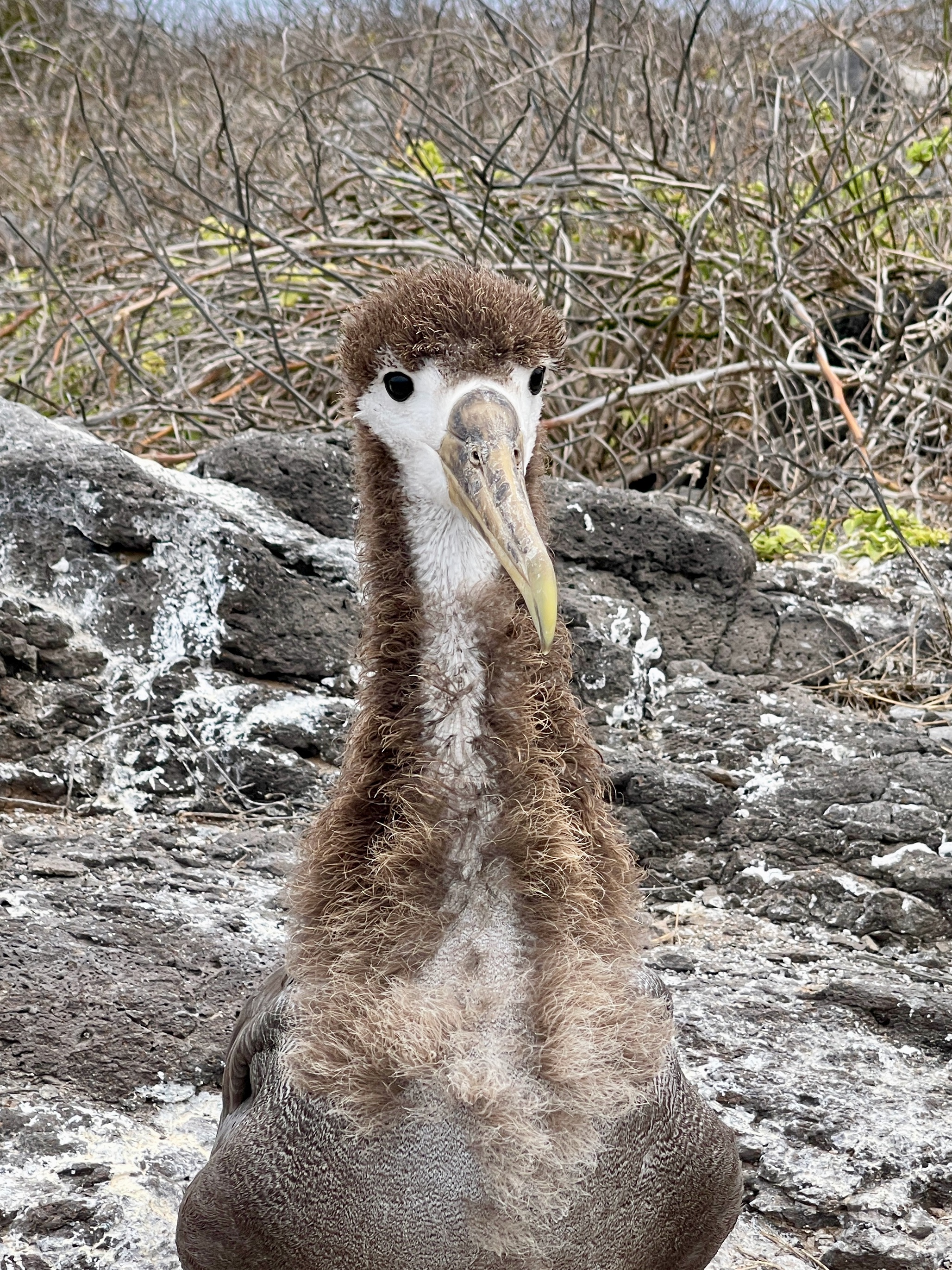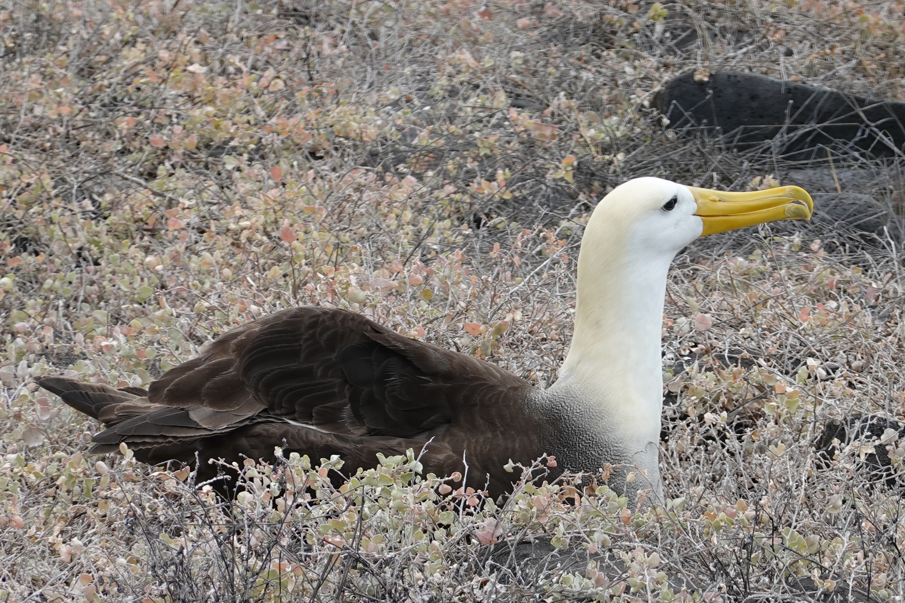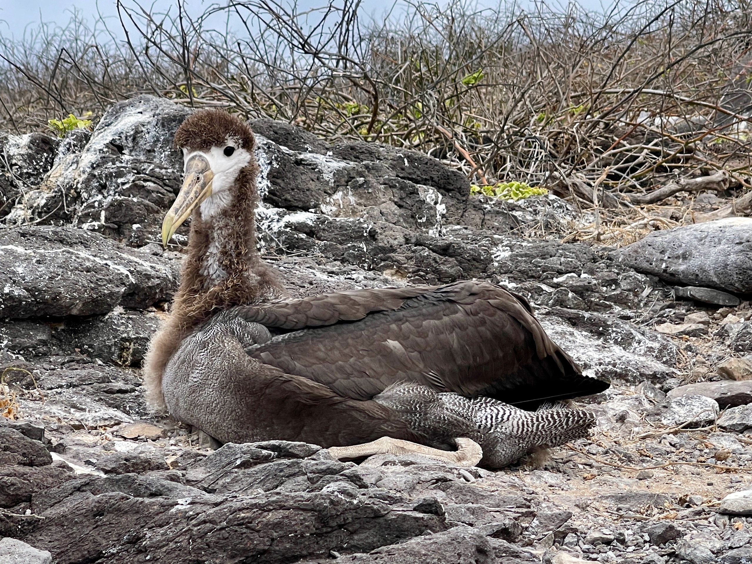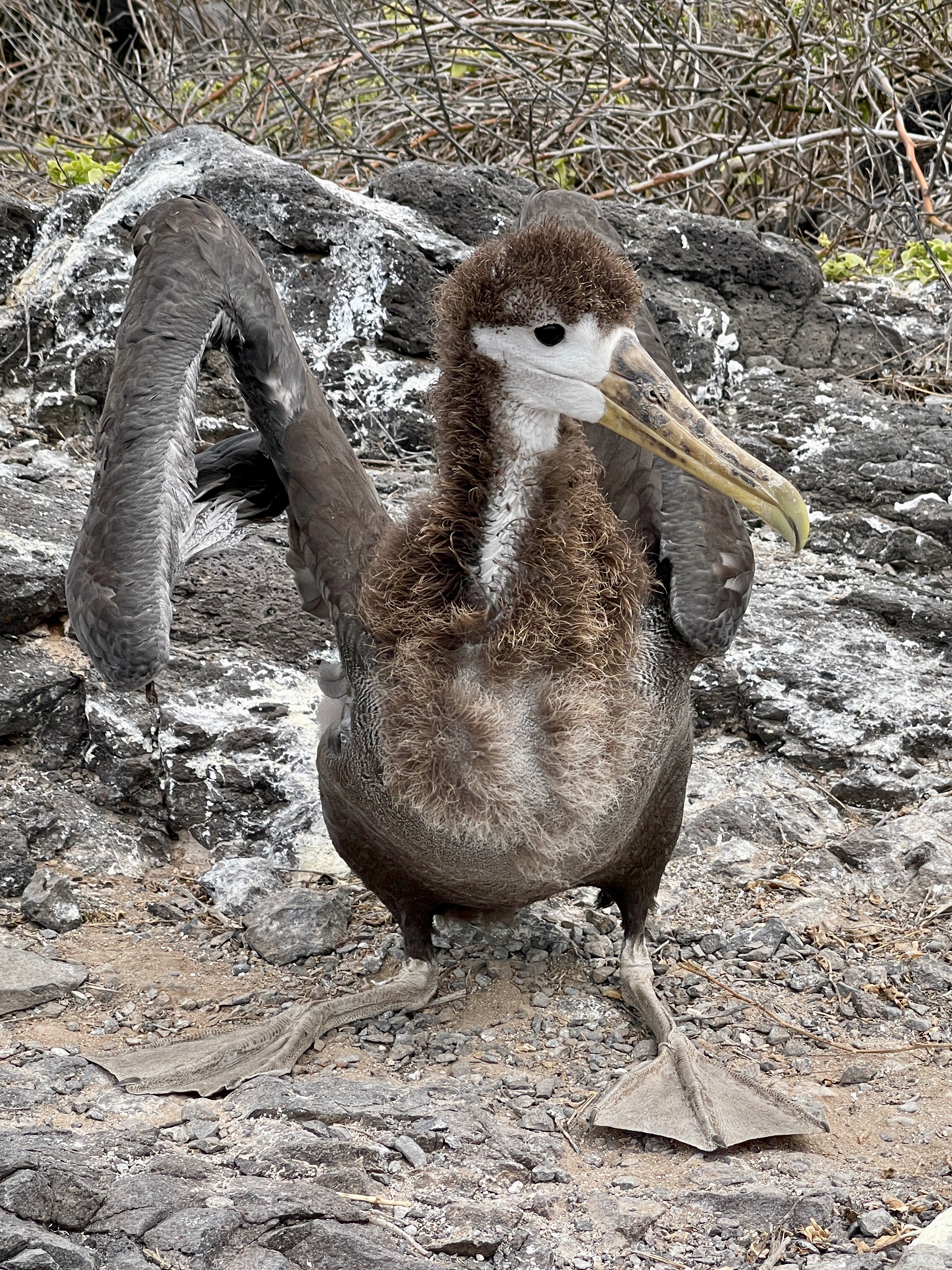 Many birds too including an occasional Blue Footed Boobie and many more Nazca Boobies (with no special foot color); also our first sighting of a Galapagos Hawk, and Albatrosses including a young one testing its wings: