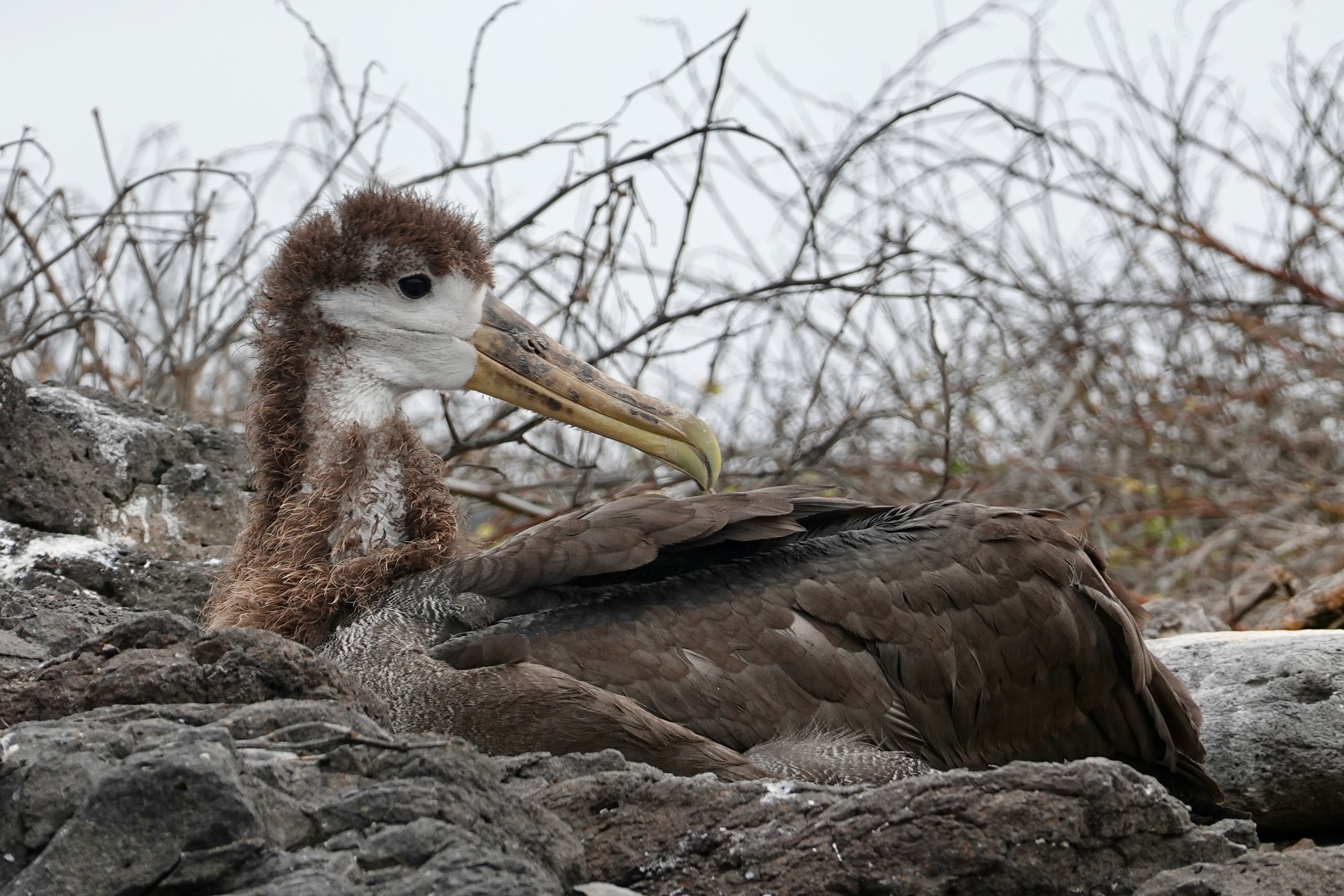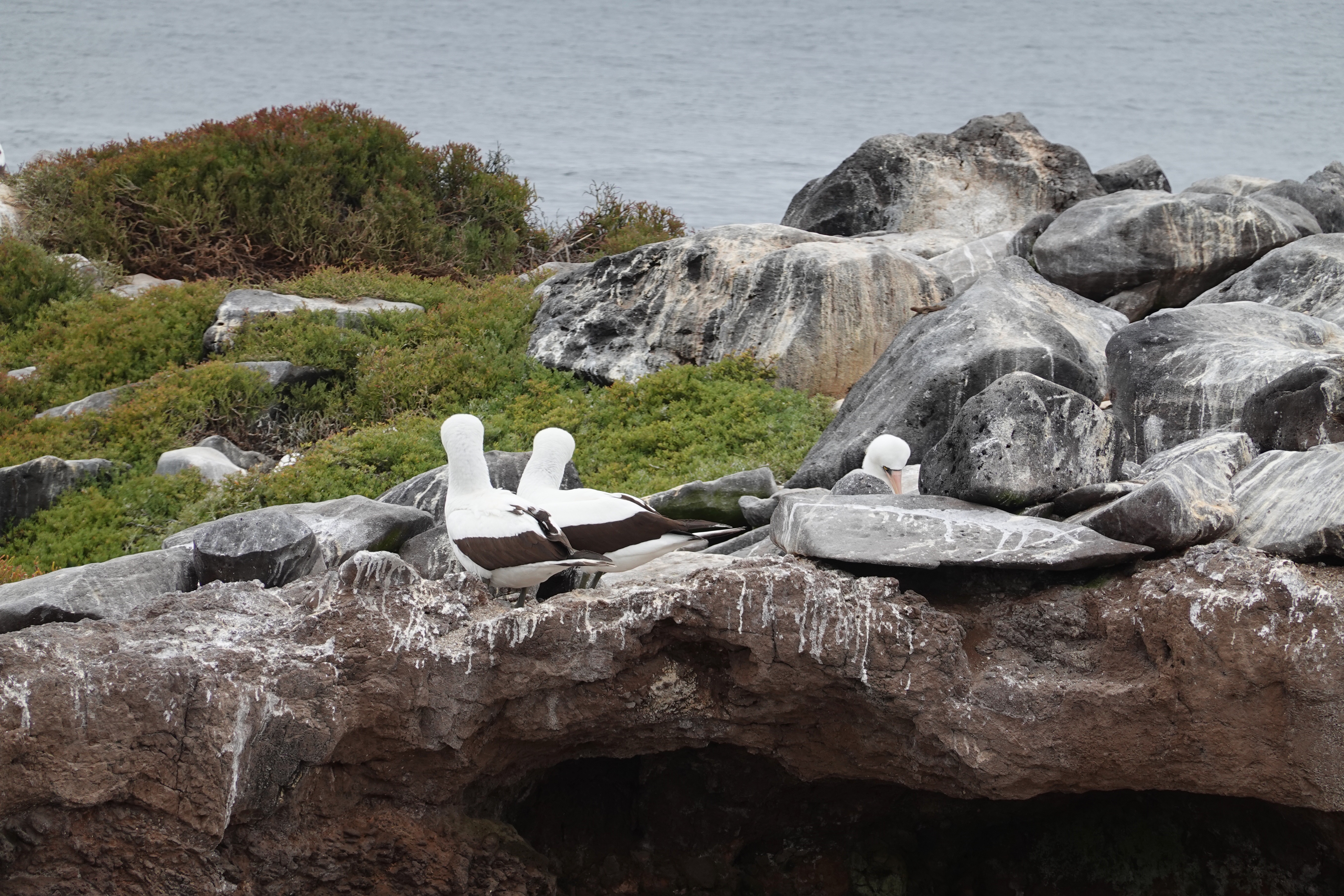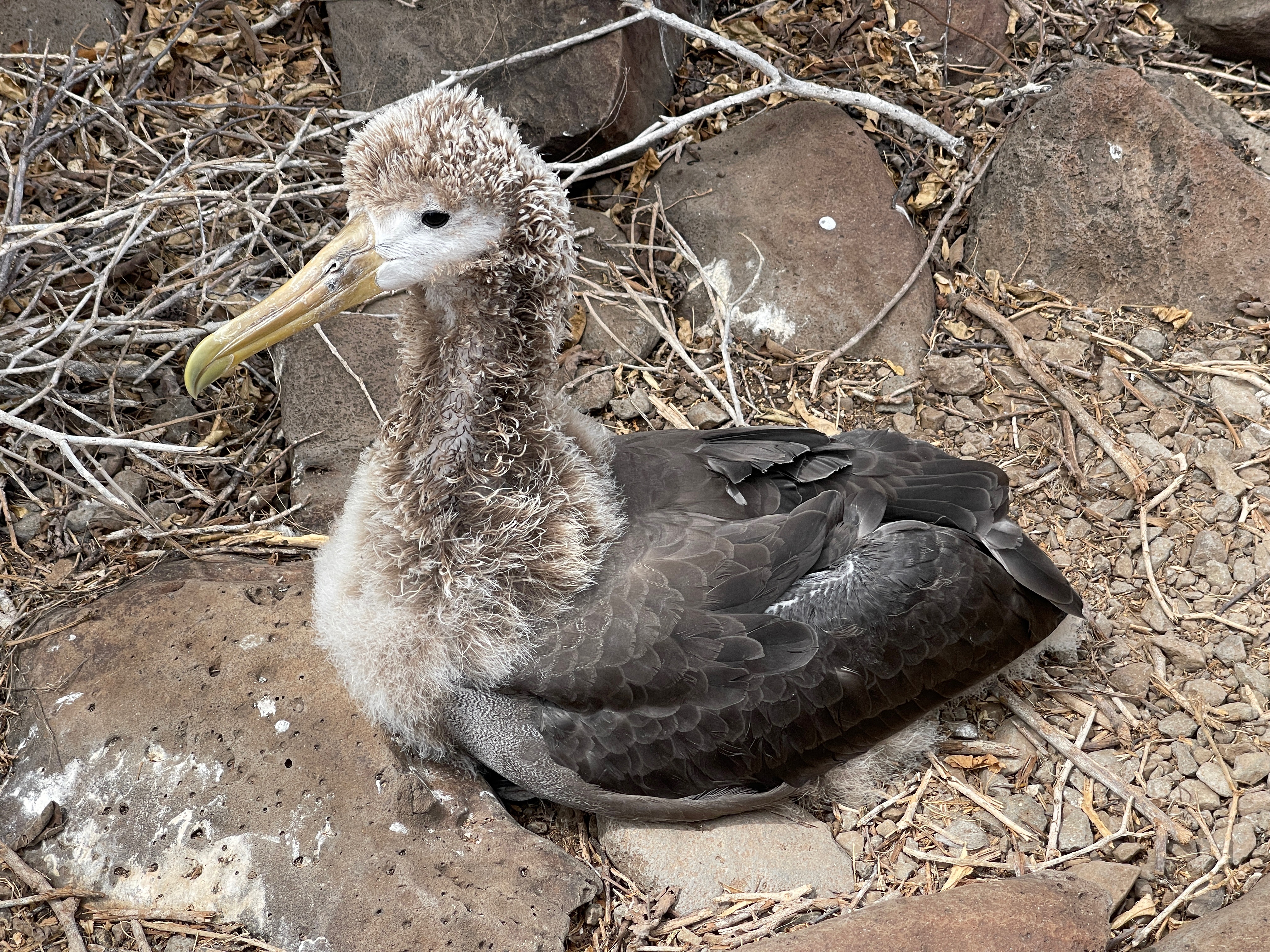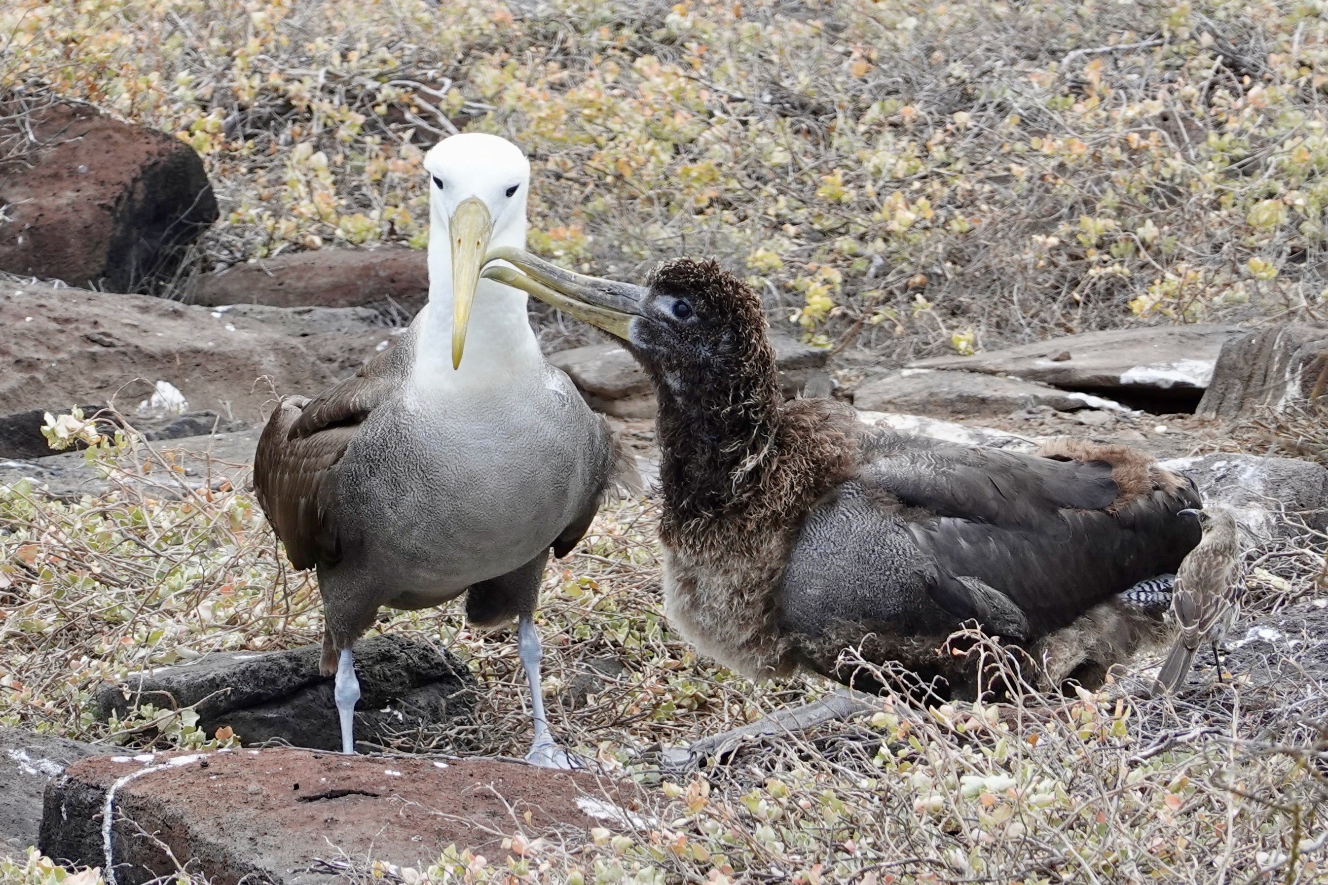 Many birds too including an occasional Blue Footed Boobie and many more Nazca Boobies (with no special foot color); also our first sighting of a Galapagos Hawk, and Albatrosses including a young one testing its wings: