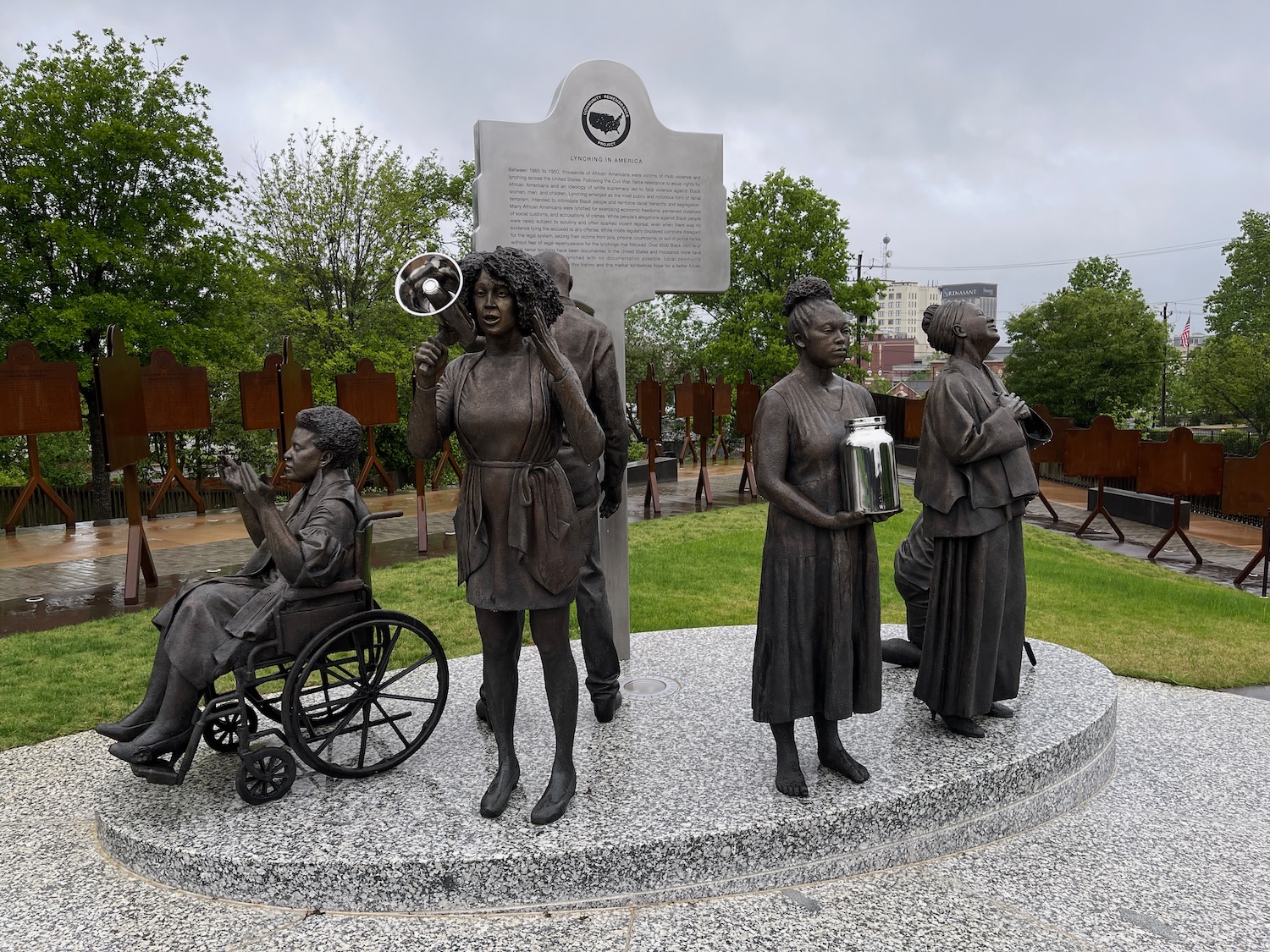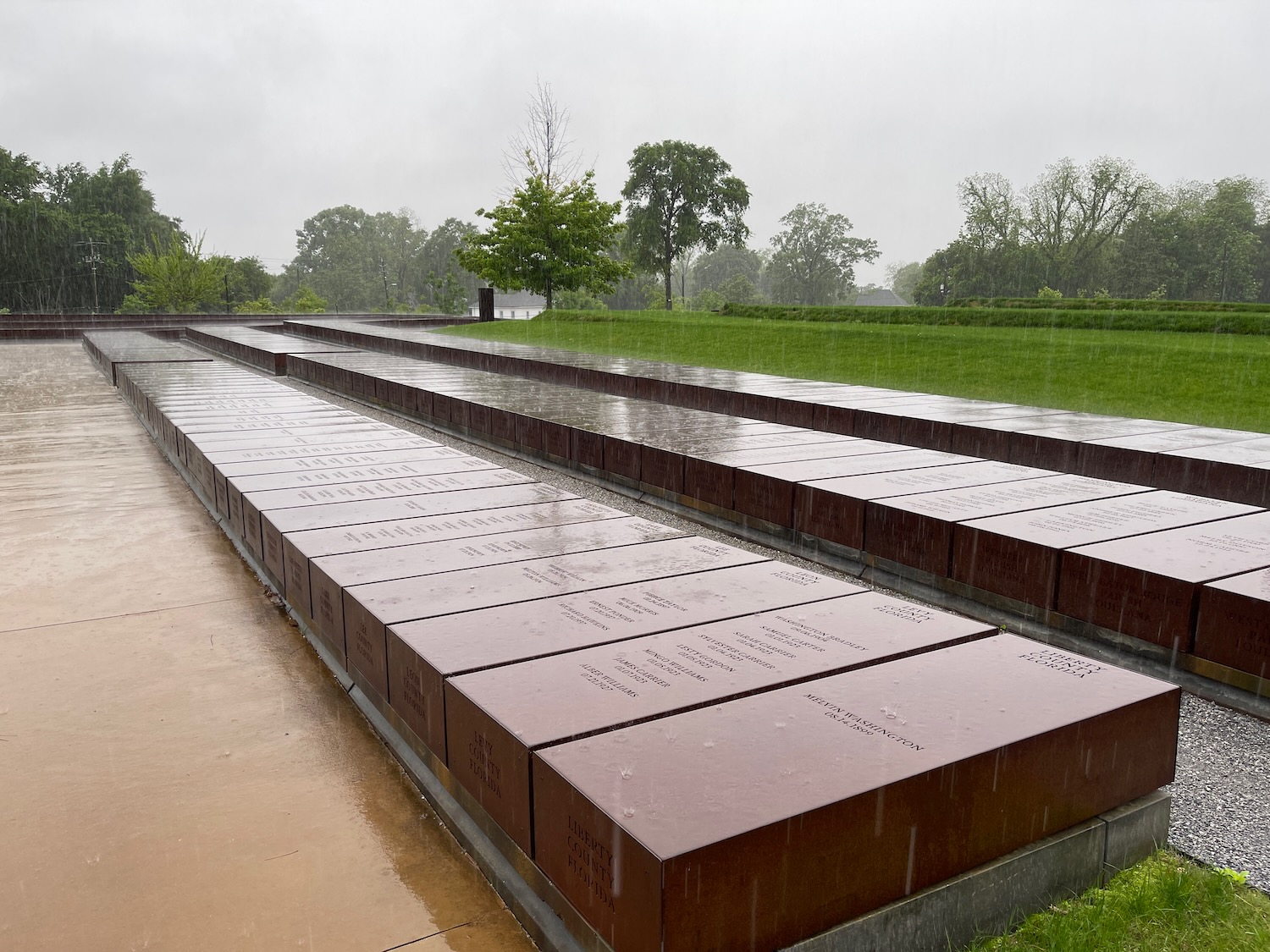 Before leaving Montgomery, we visited the Peace & Justice memorial, a quite tragic place “dedicated to the legacy of enslaved Black people …” with many too many panels listing the names of people lynched in USA even as recently as the 1950s! Too many names (and too many unknown people as well); we found a name from a town only a couple miles from where we live. Every one of the metal boxes represents one county in one state where at least one person was lynched …