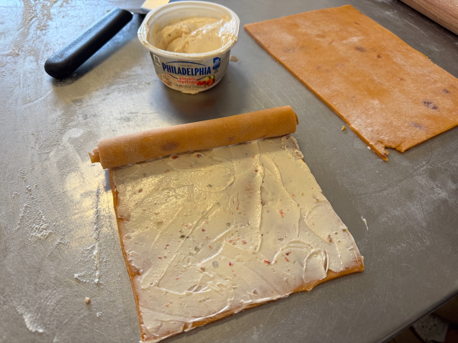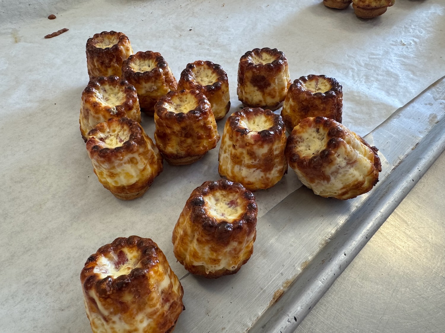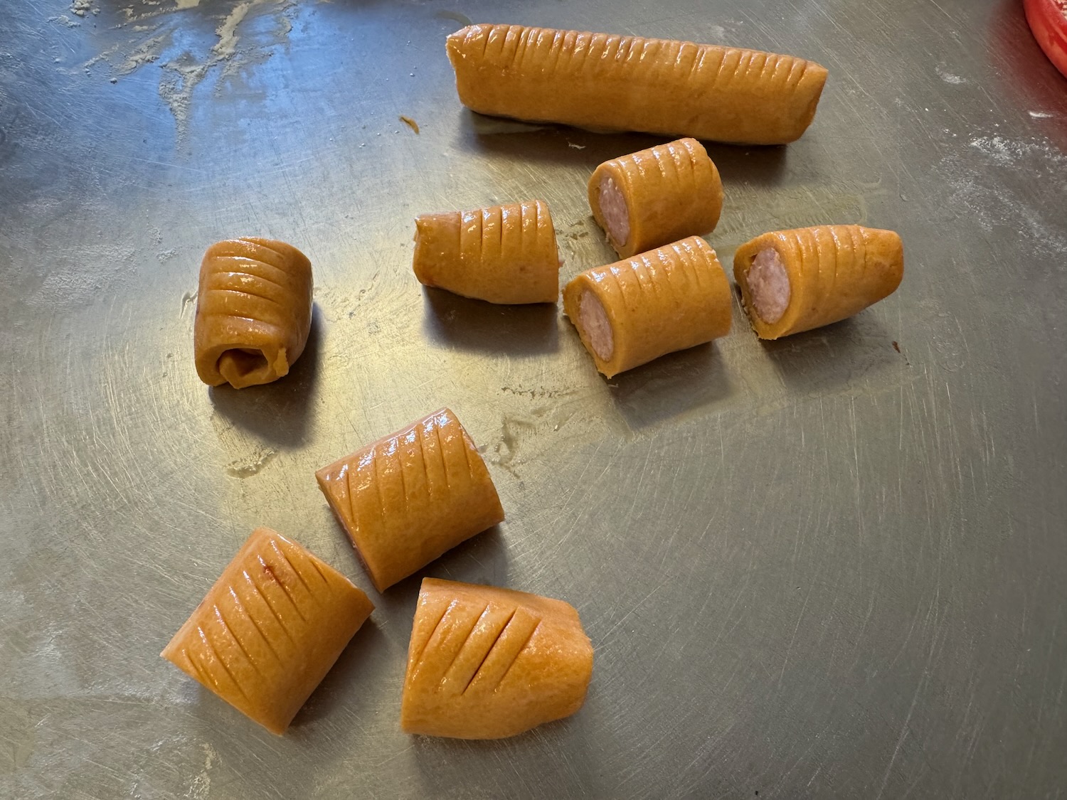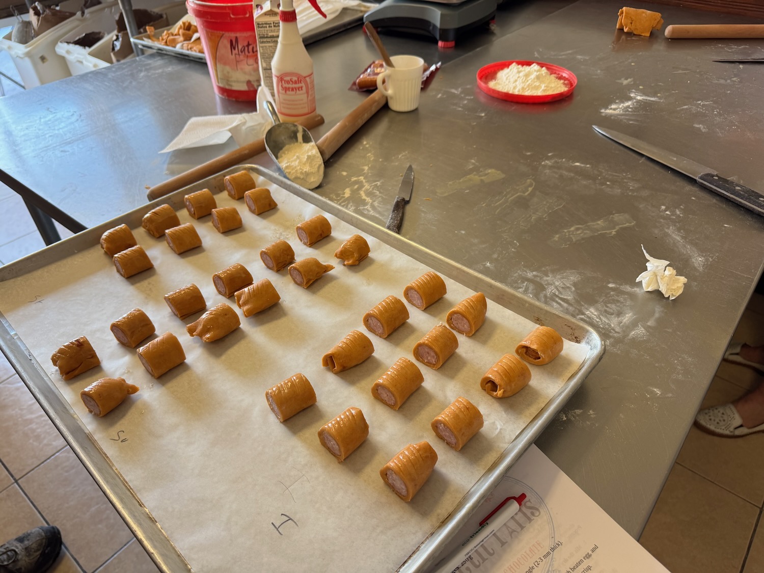 Another entertaining morning at Le Petit Paris yesterday, this time a workshop creating savory petit fours (which are small “bite size” foods); this workshop focused on using a single dough mix (with added tomato powder for color and subtle flavor) in different shapes with different fillings – we used brats (fancy hot dogs), salmon, ham, cream cheese, and more! This time I found the dough to be easy to work with, and it seems that my piping skills have improved a little since the macarons last month!