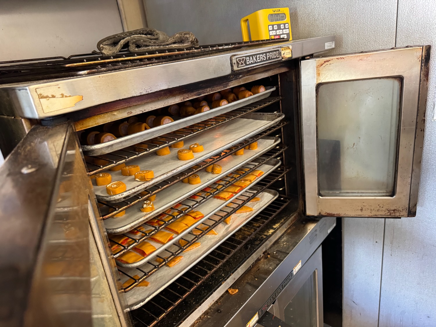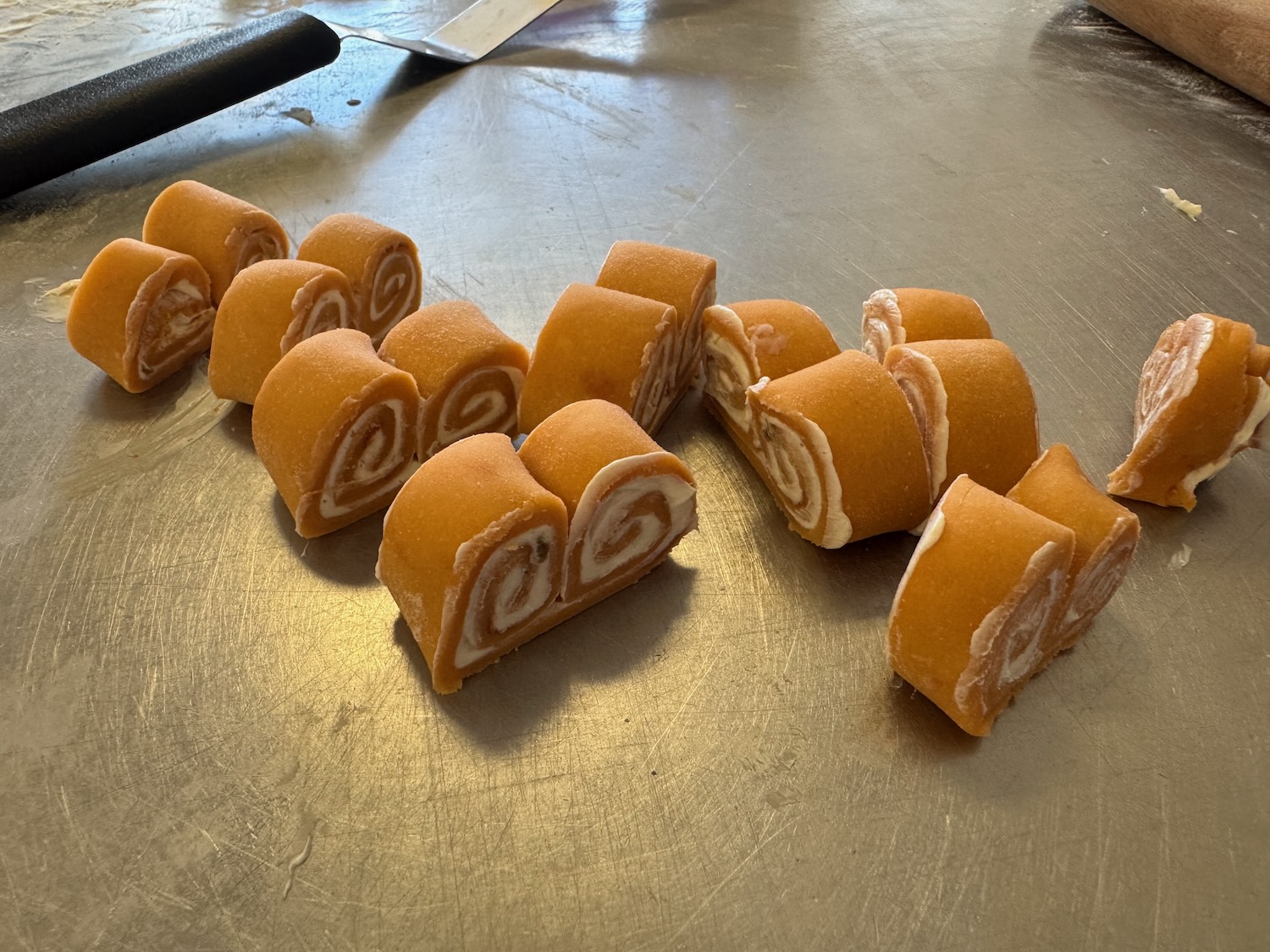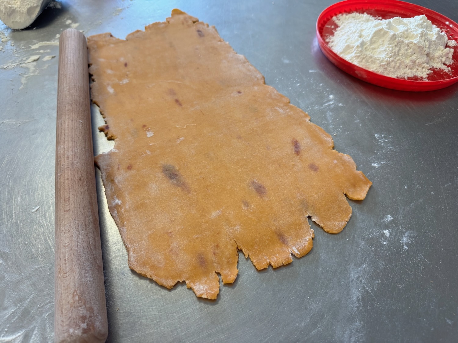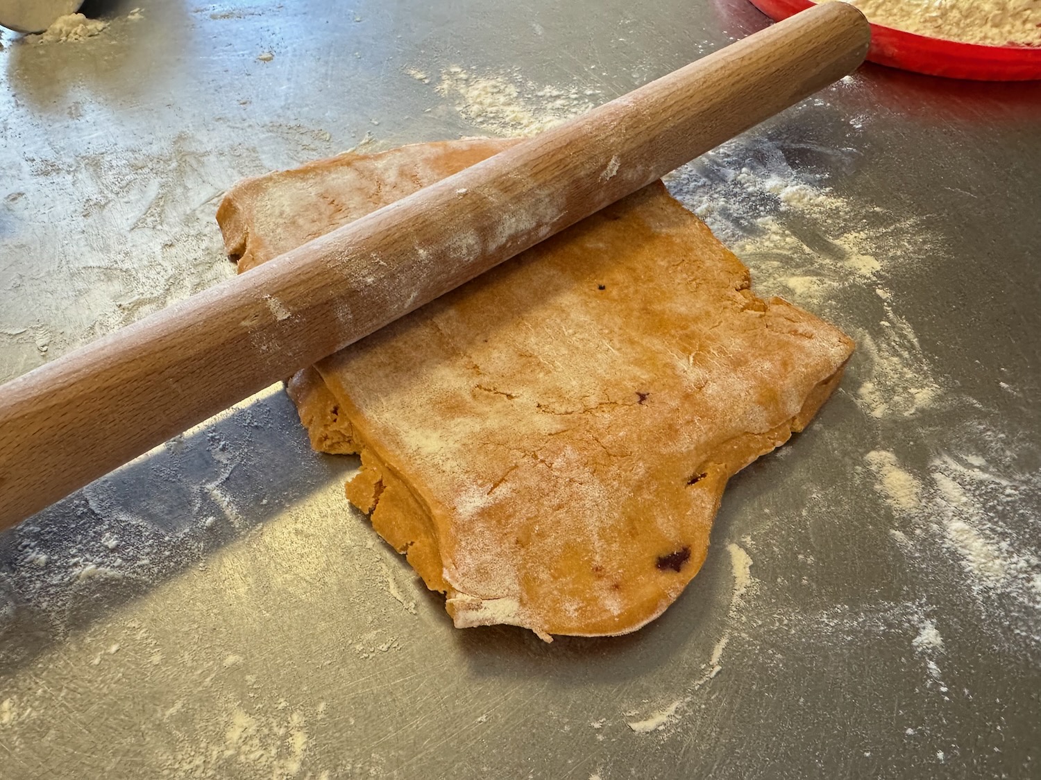 Another entertaining morning at Le Petit Paris yesterday, this time a workshop creating savory petit fours (which are small “bite size” foods); this workshop focused on using a single dough mix (with added tomato powder for color and subtle flavor) in different shapes with different fillings – we used brats (fancy hot dogs), salmon, ham, cream cheese, and more! This time I found the dough to be easy to work with, and it seems that my piping skills have improved a little since the macarons last month!
