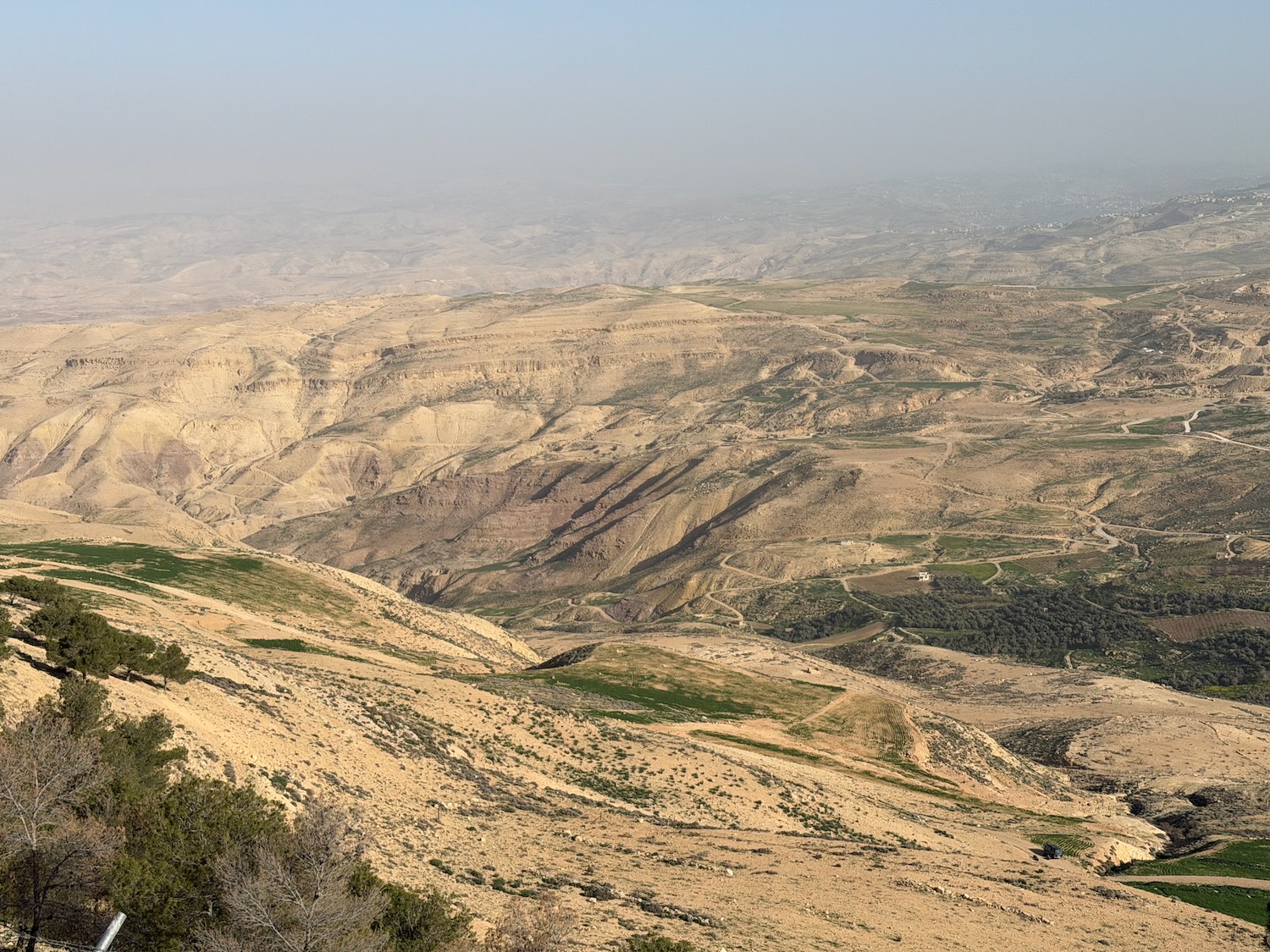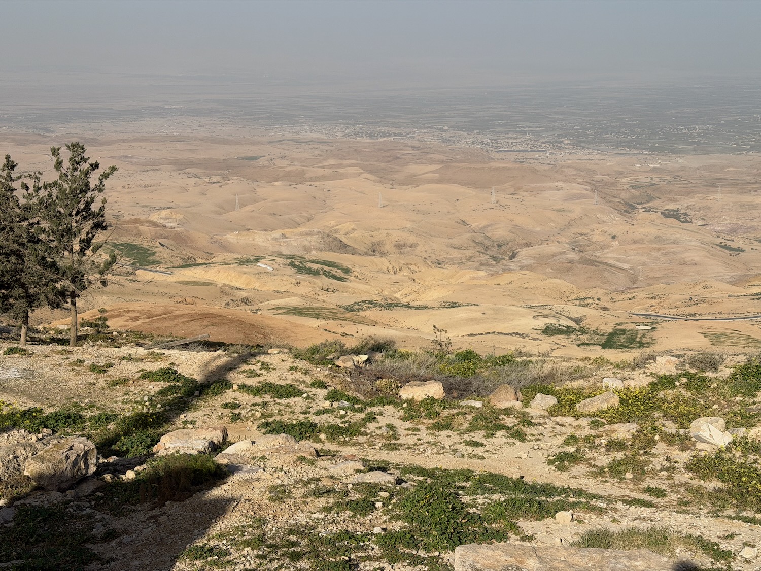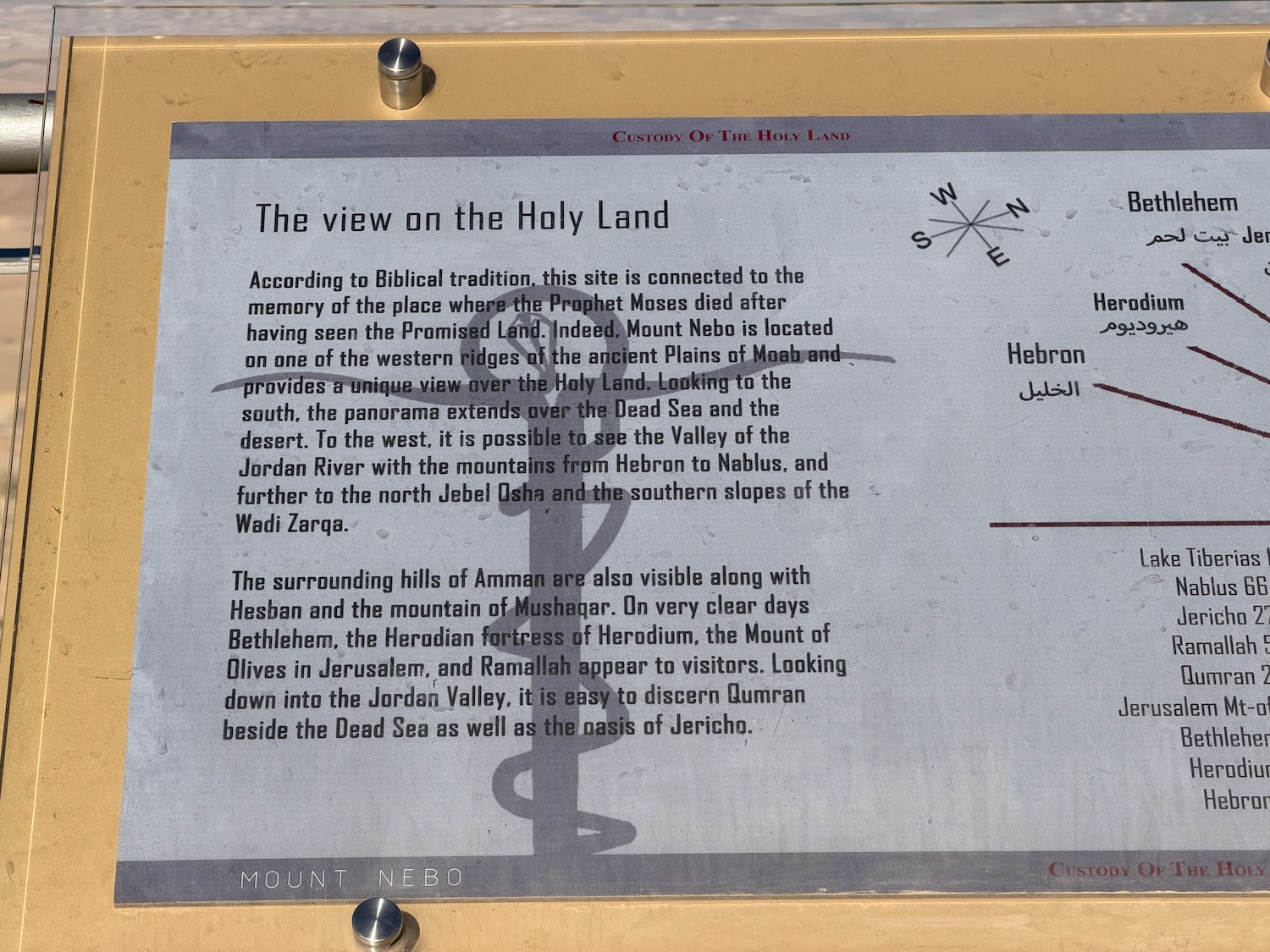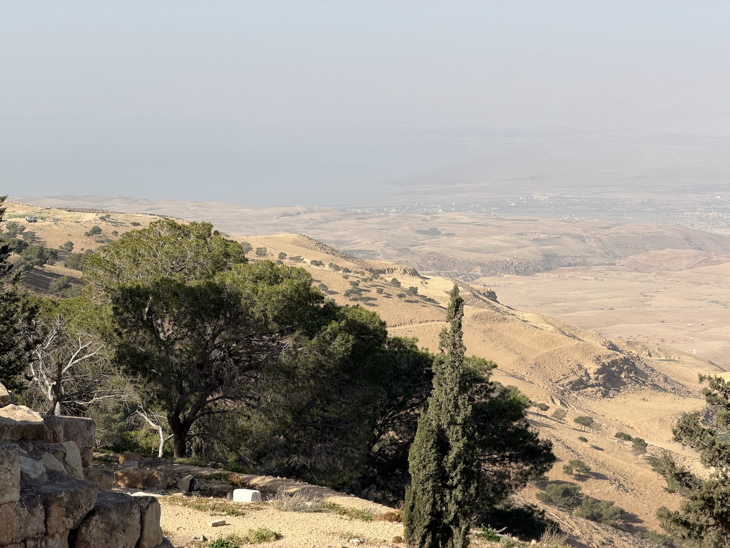 Today we were driven an interesting way from Amman to Petra, first stopping at Mount Nebo: “mentioned in the Bible as the place where Moses was granted a view of the Promised Land before his death … provides a panorama of the West Bank across the Jordan River valley …. Jericho is usually visible from the summit, as is Jerusalem on a very clear day“. It wasn’t a clear day for our visit.