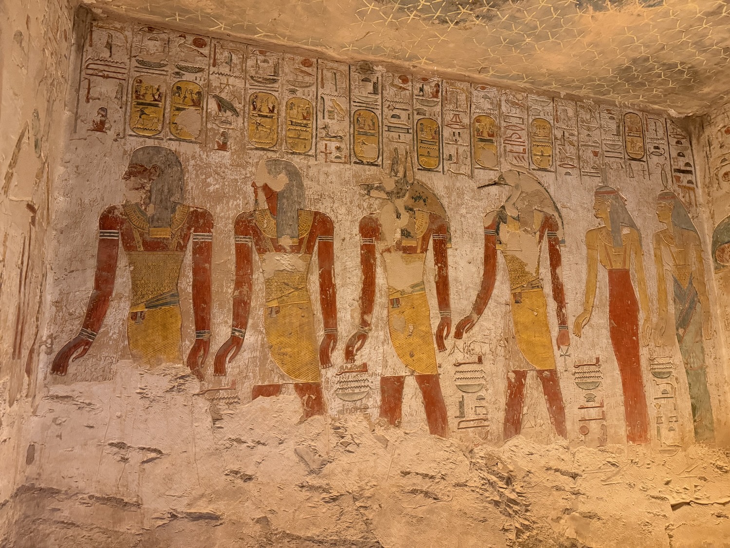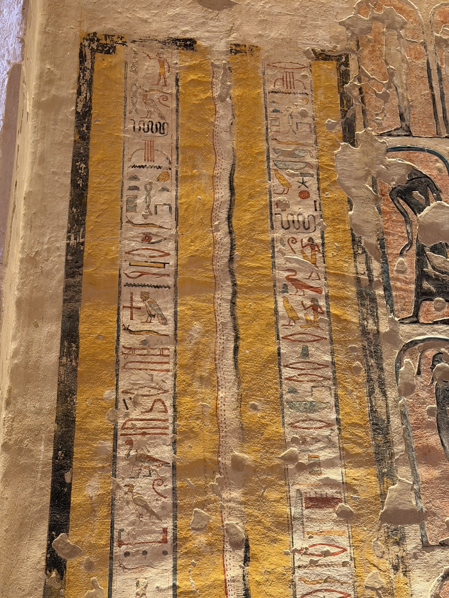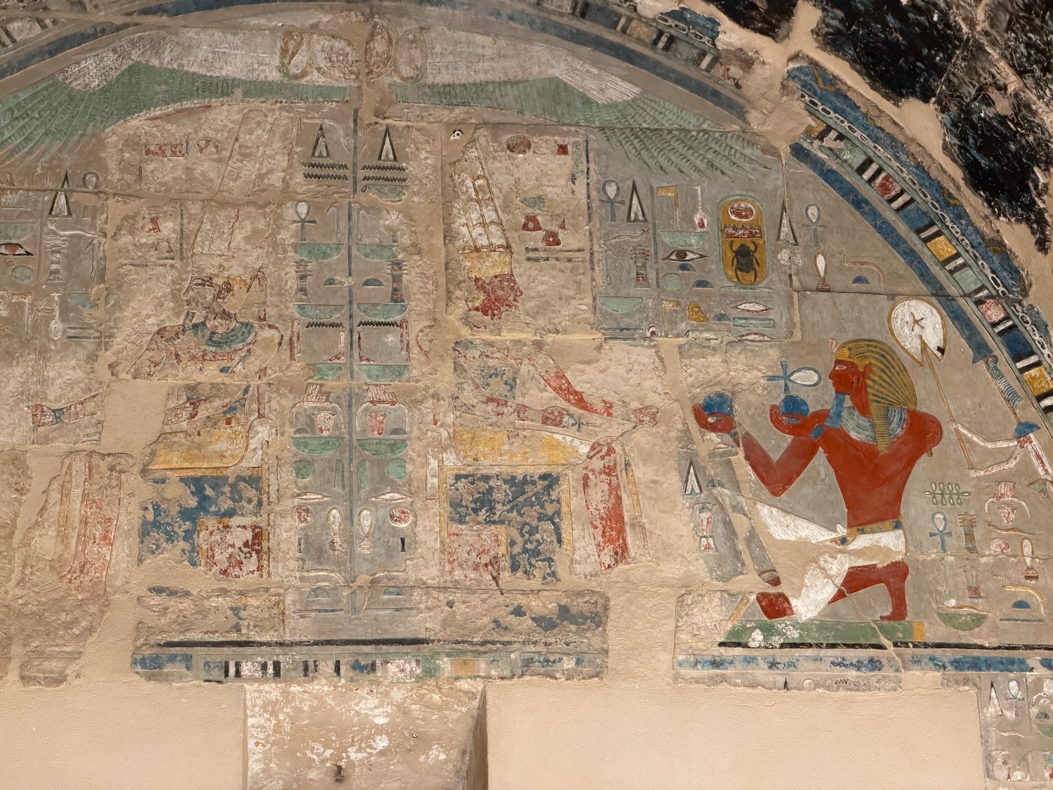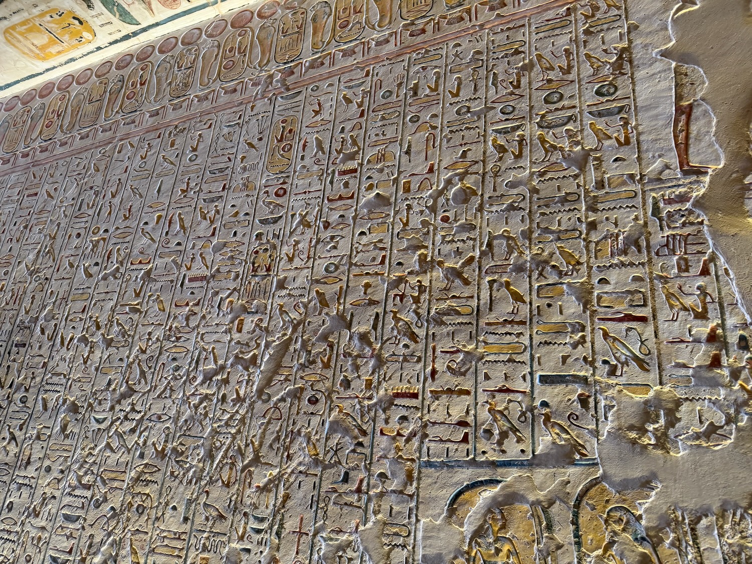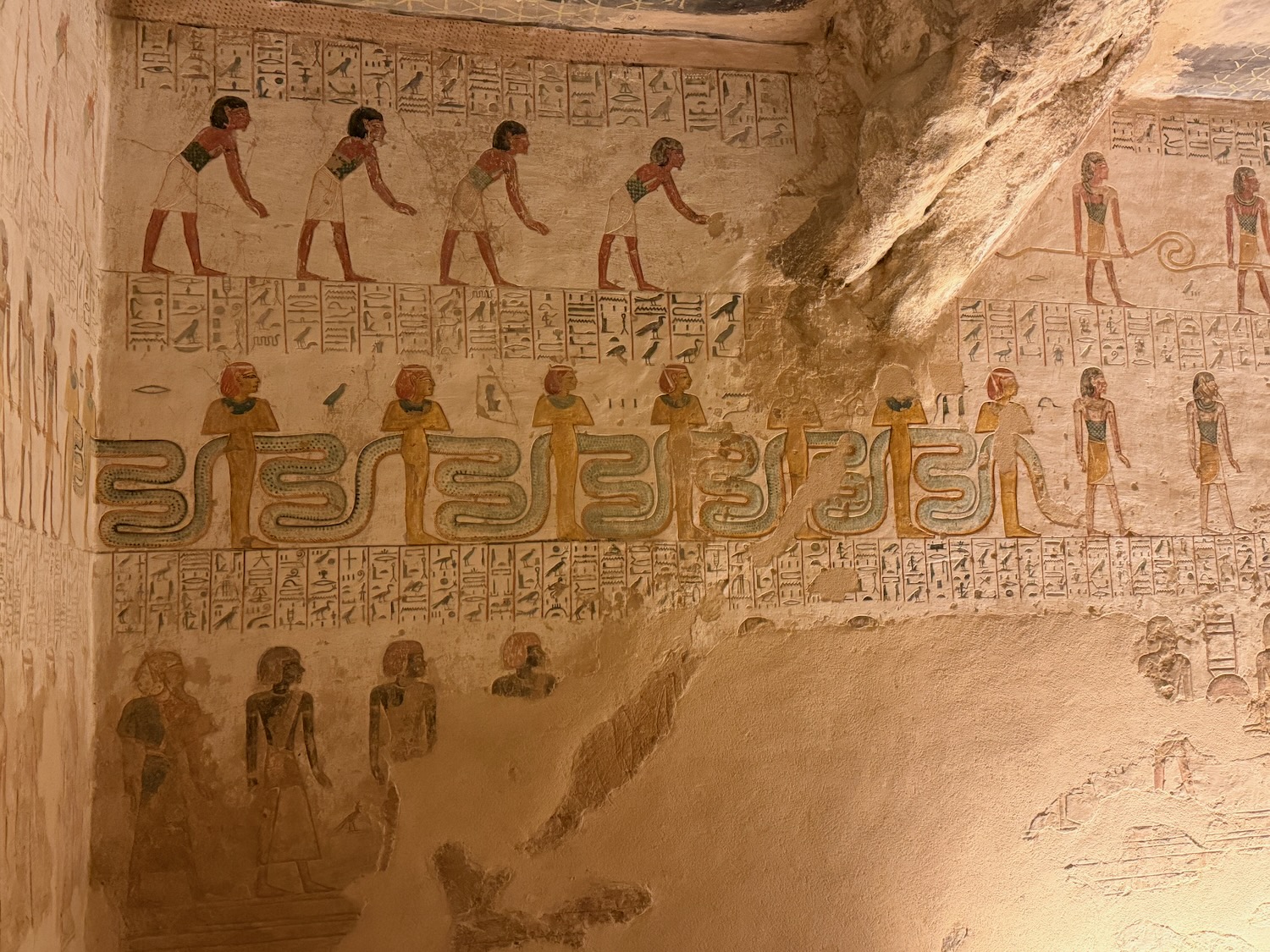 There were a number of “broken through” tomb chambers available to crawl into for a few dollars, and so I did. Of course there’s no coffin or grave goods there any more but the walls are amazingly covered in story art and other pictures … the passages are quite easy to stand up in, the only challenge is getting through the “break through” which is maybe just a couple feet wide to minimize smashing the temple walls!